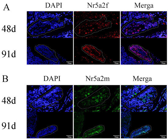 Expression of Nr5a2 (A) and Nr5a2m (B) in gonads detected by in situ hybridization. (A) Expression of Nr5a2f in undifferentiated gonads on 48 d and 91 d; (B) expression of Nr5a2m in undifferentiated gonads on 48 d and 91 d. The dashed box shows the early gonads.
