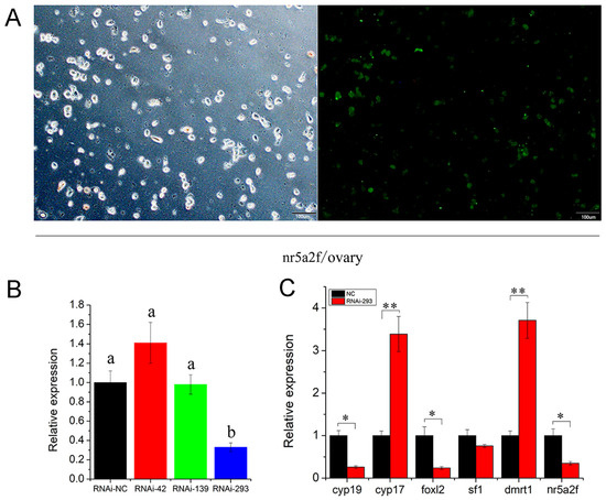 To examine the function of the Nr5a2f gene in the gonad, three RNA interference (RNAi) sites were designed based on the differential regions of Nr5a2f and Nr5a2m. Liposome 3000 was used to transfect RNAi to primary ovarian cells from one-year-old giant salamanders. The transfection efficiency was exhibited at 50% after 48 h (Figure 4A). The RNAi effects were evaluated using qPCR, which revealed that the RNAi-293 site had the best inhibition effect (Figure 4B). The expression profile of sex differentiation-related genes was detected after Nr5a2f gene expression interfered. The results showed that the expression of Nr5a2f, Foxl2 and Cyp19 genes were significantly down-regulated (Figure 4C; p < 0.05), while the expression of Dmrt1 and Cyp17 genes were remarkly up-regulated (p > 0.05). No significant difference was observed in the expression of sf1 gene (p > 0.05). The results indicate that the Nr5a2f gene regulated the expression of sex differentiation-related genes and participated in the regulation of the sex differentiation process of giant salamanders.
