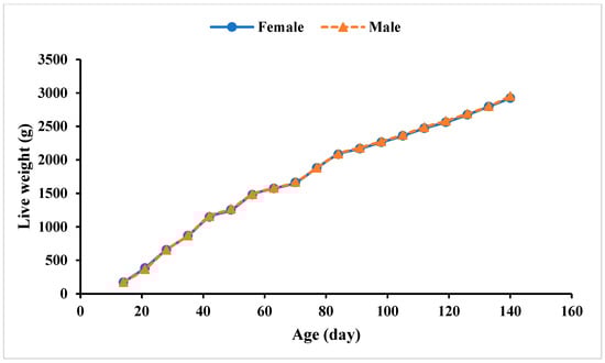 Mean live weight (g) of male and female rabbits at different sampling ages.