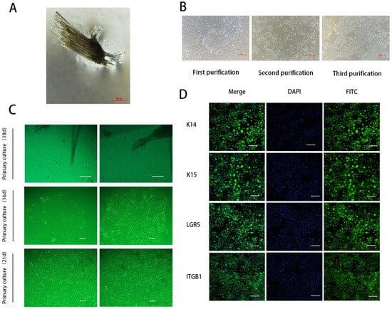 HFSCs are pluripotent stem cells located in the bulge area. The descendant cells migrate upward to the epidermis and downward to form a hair shaft. Moreover, HFSCs are one of the widely used model systems for studying adult stem cells [24,25,26]. Secondary hair follicles were isolated from the tissues through trypsin digestion (Figure 1A), and hair bulbs were obtained. After adherent culture, the cells gradually migrated out of the hair bulbs (Figure 1C). Because the isolated cells included SHFSCs and secondary dermal papilla cells, we used trypsin for multiple short-term digestions to obtain secondary HFSCs with relatively high purity (Figure 1B). We then identified the isolated cells using immunofluorescence. The results showed that the surface markers K14, K15, LGR5, and ITGβ1 of SHFSCs were immunofluorescence-positive (Figure 1D). K14 and K15 are keratin family markers of epithelial stem cells [27,28], LGR5 is a classical stemness marker in the hair follicle bulge [29], and ITGβ1 plays a key role in HFSC adhesion and maintenance [30]. Taken together, these results indicated that SHFSCs were isolated with relatively high purity.