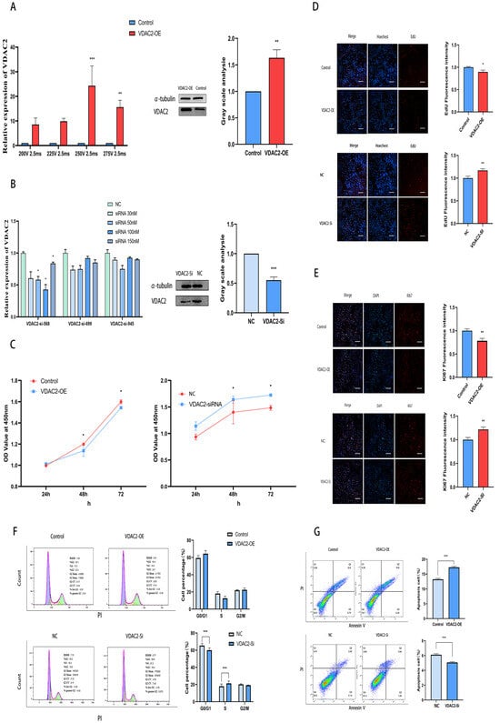 VDAC2 promotes the apoptosis of SHFSCs. (A) Detection of the optimal transfection conditions for the VDAC2 overexpression vector in SHFSCs and the mRNA and protein levels after VDAC2 overexpression. (B) Detection of the VDAC2 mRNA and protein levels after VDAC2 interference in SHFSCs. (C) CCK-8 assay after overexpression and interference of VDAC2 in SHFSCs. (D) EdU assay after overexpression and interference of VDAC2 in SHFSCs. Scale bar = 500 µm. (E) Ki67 immunofluorescence assay after overexpression and interference of VDAC2 in SHFSCs. Scale bar = 500 µm. (F) Cell cycle detection after overexpression and interference of VDAC2 in SHFSCs. (G) Cell apoptosis detection after overexpression and interference of VDAC2 in SHFSCs. (* p < 0.05; ** p < 0.01; *** p < 0.001).