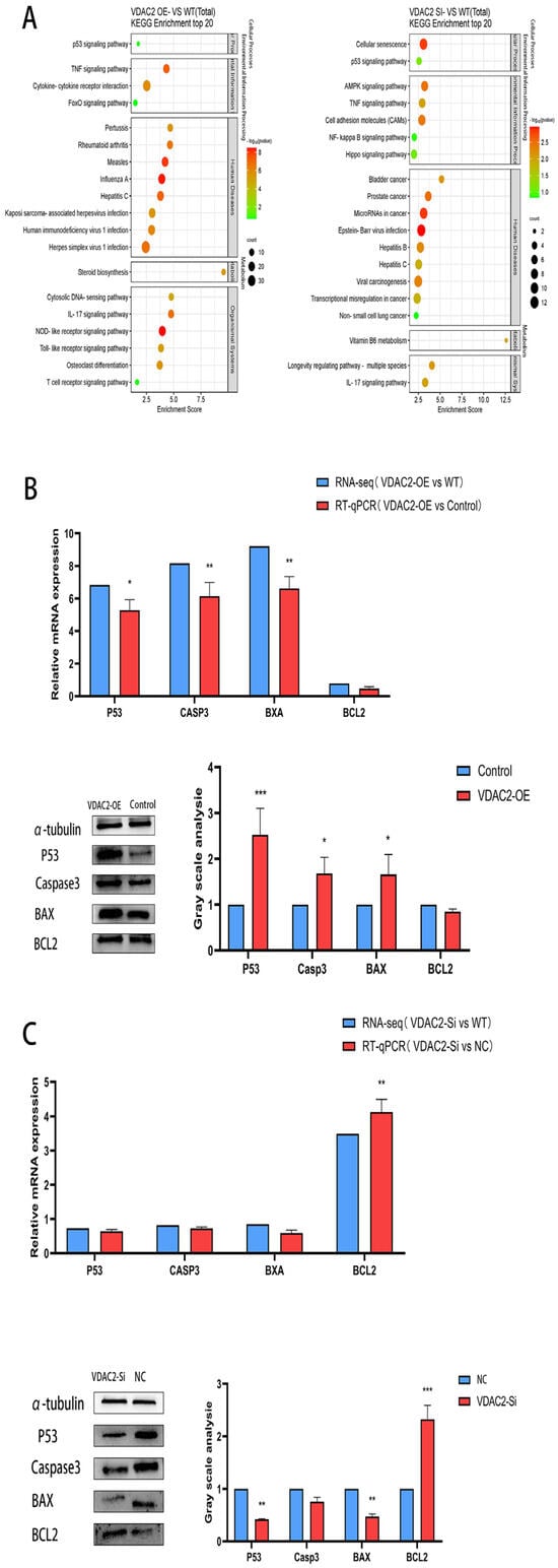 VDAC2 regulates SHFSC apoptosis through the P53 signaling pathway. (A) KEGG enrichment analysis of the DEGs obtained after VDAC2 overexpression and interference. (B) mRNA and protein expression levels of the key genes in the P53 signaling pathway after VDAC2 overexpression in SHFSCs. (C) mRNA and protein expression levels of the key genes in the P53 signaling pathway after VDAC2 interference in SHFSCs. (* p < 0.05; ** p < 0.01; *** p < 0.001).