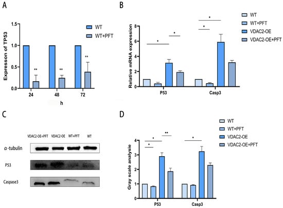 As it was previously found that VDAC2 could affect the apoptosis of SHFSCs through the P53 signaling pathway, we attempted to identify a drug to determine whether it could inhibit the occurrence of cell apoptosis. PFT, an inhibitor of P53, stabilizes the mitochondrial membrane and inhibits the release of cytochrome C, thereby impeding the intrinsic apoptotic pathway. When its working concentration is 10 μM, it can inhibit the binding of P53 to mitochondria by reducing the affinity of P53 for the anti-apoptotic proteins Bcl-xL and Bcl2 [23]. We added PFT to wild-type SHFSCs, used RT-qPCR to detect the expression levels of P53, and determined that the optimal addition time was 24 h (Figure 5A). After adding PFT to SHFSCs transfected with the VDAC2 overexpression vector, RT-qPCR and Western blotting results showed that the expression levels of P53 and Casp3 were both decreased at the mRNA and protein levels (Figure 5B–D). These results further prove that VDAC2 affects the apoptosis of SHFSCs through the P53 signaling pathway.