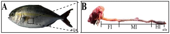 (A) schematic diagram of the digestive tract of a juvenile S. dumerili. (A), The experimental fish; (B), Schematic diagram of different segments of the intestine. FI: Anterior intestine; MI: Middle intestine; HI: Posterior intestine.