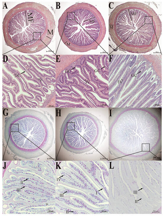 H&E staining (A–F) and AB-PAS staining (G–L) of the intestine of six-month-old S. dumerili. (A,D,G,J): foregut; (B,E,H,K): midgut; (C,F,I,L): hindgut. MF: intestinal folds; M: muscularis propria; IV; brush border microvillus. GC: goblet cells, I: type I mucous cells; II: type II mucous cells; III: type III mucous cells; IV: type IV mucous cell.