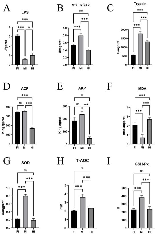Enzyme activities and biochemical indices in different intestinal segments in S. dumerili. (A): LPS, lipase; (B): AMS, α-amylase; (C): Trypsin; (D): ACP, acid phosphatase; (E): AKP, alkaline phosphatase; (F): MDA, Malondialdehyde; (G): SOD: Superoxide dismutase; (H): T-AOC, Total antioxidant capacity; (I): GSH-Px, Glutathione peroxidase; *, p ≤ 0.05; **, p ≤ 0.01; ***, p ≤ 0.001; ns, p ≥ 0.05.
