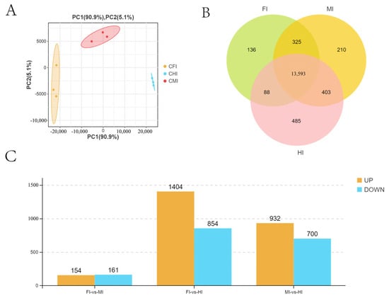 A total of nine cDNA libraries were constructed and sequenced, representing the foregut (FI1, FI7, FI10), midgut (MI1, MI4, MI10), and hindgut (HI1, HI4, HI10). After quality filtering, 398,576,440 clean reads were obtained, with Q30 values exceeding 91.6% and GC content close to 50%, indicating high-quality sequencing data (Table S2). Principal Component Analysis (PCA) revealed distinct clustering of samples by intestinal segment, confirming biological replication robustness and suggesting functional differences (Figure 4A).