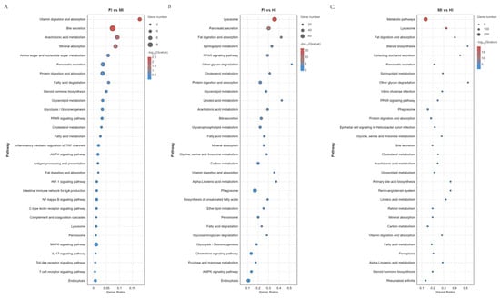 KEGG pathway enrichment analysis of the DEGs obtained by RNA-seq.(A) FI vs MI. (B) FI vs HI. (C) MI vs HI. The diameter of the circles represents the number of genes. The colors bar, from red to blue, represents the significance level of enrichment.