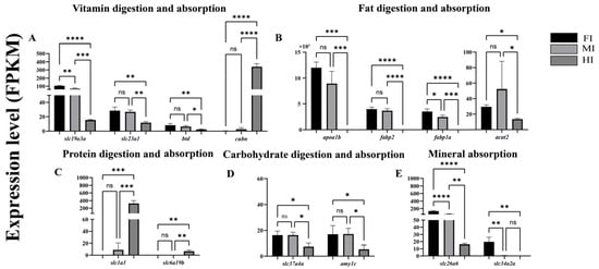 Differentially expressed genes (DEGs) associated with the digestion and absorption of sugars, proteins, fats, and inorganic salts in different intestinal segments of S. dumerili are presented (log2 (fold change, FC) > 1 and false discovery rate, FDR ≤ 0.05). The data are derived from fragments per kilobase of transcript per million mapped reads (FPKM) values obtained through RNA sequencing (RNA-—seq) analysis. (A): Genes associated with vitamin digestion and absorption; (B): Genes associated with fat digestion and absorption; (C): Genes associated with protein digestion and absorption; (D): Genes associated with carbohydrate digestion and absorption; (E): Genes associated with mineral absorption. *, p ≤ 0.05; **, p ≤ 0.01; ***, p ≤ 0.001,****, p ≤ 0.0001; ns, p ≥ 0.05.