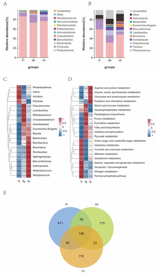 Changes in the relative abundance of gut microbes in different gut segments of S. dumerili. (A): Stacked species distribution at the phylum level; (B): Stacked species distribution at the genus level; (C): Heat map displaying species abundance at the genus level; (D): Heat map of Tax4Fun KEGG function prediction; (E): Venn diagram illustrating gut microbial classification across the different gut segments of S. dumerili.