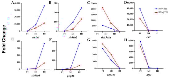To validate the RNA-seq results, four upregulated (slc1a1, slc10a2, grtp1b, slc30a8) and four downregulated (ca7, slc15a1a, aqp10a, alp3) genes were randomly selected for qRT-PCR analysis. The expression levels of these genes were consistent with the RNA-seq data, confirming the reliability of the transcriptome results (Figure 8).