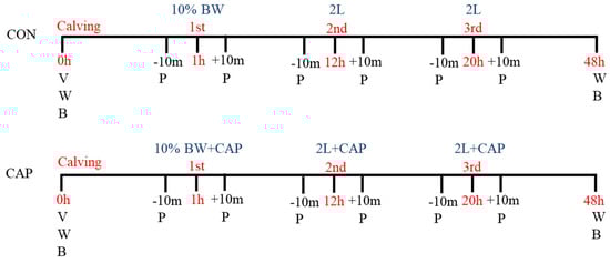 Experimental protocol. CON = Control group; CAP = Group supplemented with 40 mg of capsaicin. V = Vitality assessment (Calf VIGOR Score); W = Body weight measurement; B = Blood sampling; P = Physiological evaluation (heart rate, respiratory rate, and rectal temperature, assessed 10 min before colostrum feeding “-10 m” and 10 min after “+10 m”); 10% BW = First colostrum dose equivalent to 10% of body weight; 2 L = 2 L of colostrum at 12 h (second dose) and at 20 h (third dose).