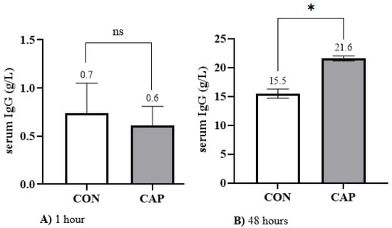 Mean ± standard error of serum immunoglobulin G (IgG) concentration measured at 1 h ((A): 1 h) and 48 h ((B): 48 h) after calving in control (CON) and capsaicin-supplemented (CAP) groups. Student’s t-test, p < 0.05. * Indicates statistically significant differences between groups. ns: no difference between groups.