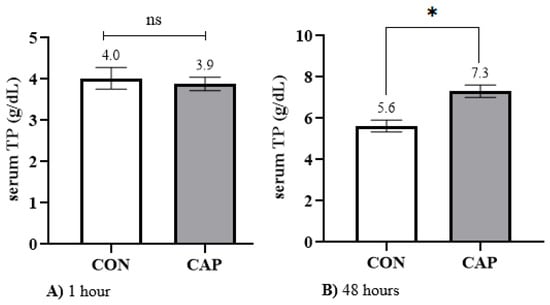 Mean ± standard error of serum total protein (TP) concentration measured at 1 h ((A): 1 h) and 48 h ((B): 48 h) after calving in control (CON) and capsaicin-supplemented (CAP) groups. Student’s t-test, p < 0.05. * Indicates statistically significant differences between groups. ns: no difference between groups.