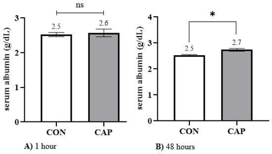 Mean ± standard error of serum albumin (Alb) concentration measured at 1 h ((A): 1 h) and 48 h ((B): 48 h) after calving in control (CON) and capsaicin-supplemented (CAP) groups. Student’s t-test, p < 0.05. * Indicates statistically significant differences between groups. ns: no difference between groups.