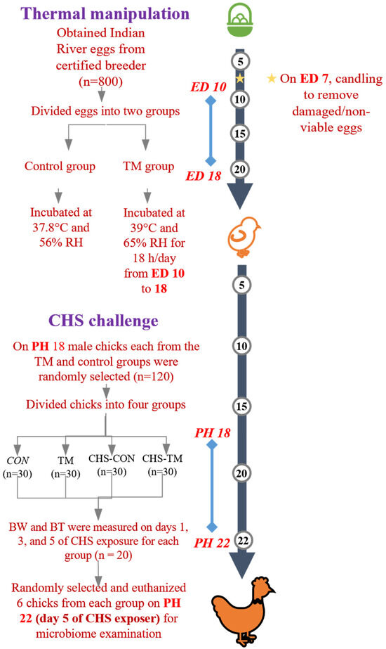 This study aimed to investigate the effect of TM (39 °C for 18 h at embryonic days 10–18) on broiler chickens’ body weight, body temperature, and cecal microbiome during CHS on post-hatch days 18 to 22. Previous studies employing a similar TM protocol in Cobb and Hubbard broiler breeds under heat stress conditions reported beneficial effects, including a reduced oxidative stress gene expression, the modulation of inflammatory cytokines and heat shock proteins, and an enhanced antioxidant capacity [41,42].