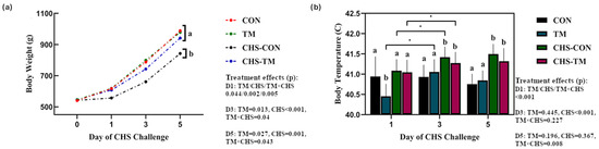 Effects of chronic heat stress (CHS) and thermal manipulation (TM) on broiler chickens (n = 6). (a) Body weight (BW) gained over five days of the CHS challenge. (b) Body temperature (BT) on days 1, 3, and 5 of the CHS challenge. Different superscript letters and * indicate significant differences (p < 0.05).