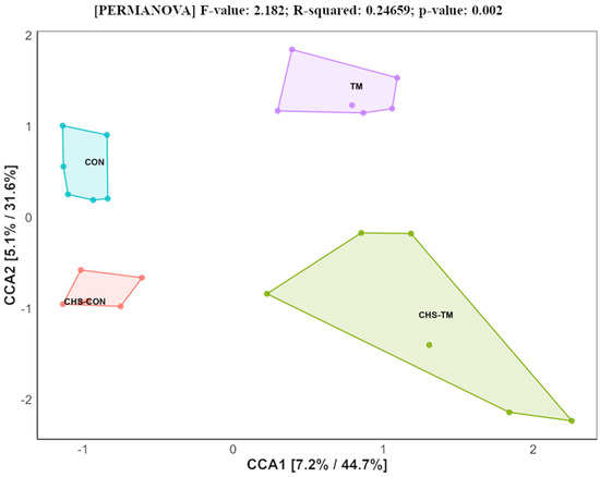 Pairwise PERMANOVA comparisons indicated no significant differences in the microbial community structure between the CHS-CON and CON (p = 0.398) or between the CHS-TM and TM (p = 0.08), suggesting a relatively limited influence of CHS on beta diversity. In contrast, significant differences were observed between the TM and CON (p = 0.041) and between the TM and CHS-CON (p = 0.012), highlighting the more pronounced effect of TM on the microbial community structure.