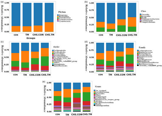 Bar plots showing the relative abundance of the cecum microbiota composition taxa at different taxonomic levels across experimental groups (n = 6). (a) Phylum, (b) class, (c) order, (d) family, and (e) genus. CON = control group; TM = thermal manipulation group; CHS-CON = control with chronic heat stress challenge group; and CHS-TM = thermal manipulation with chronic heat stress challenge group.