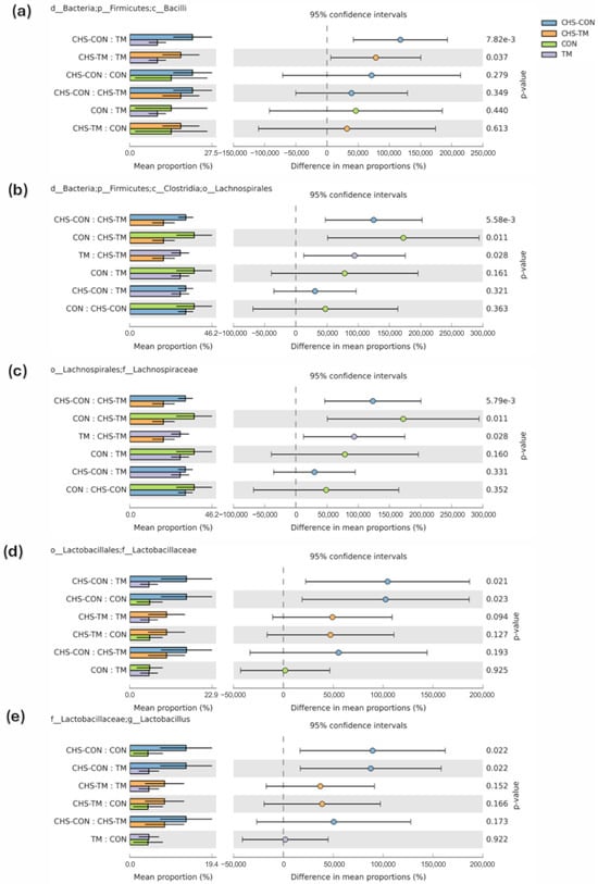 Relative abundance and differences in the mean proportions of bacterial taxa across treatment groups (n = 6) with 95% confidence intervals. Taxonomic comparisons include (a) Bacilli, (b) Lachnospirales, (c) Lachnospiraceae, (d) Lactobacillaceae, and (e) Lactobacillus. Significant p-values indicate statistically meaningful differences among groups: CON = control group; TM = thermal manipulation group; CHS-CON = control with chronic heat stress challenge group; and CHS-TM = thermal manipulation with chronic heat stress challenge group.
