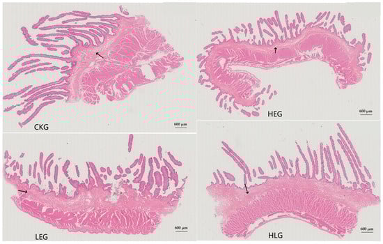 Rumen tissue morphology for the yak diets of CKG (0.11 MJ/kg NEG), LEG (2.12 MJ/kg NEG), HEG (2.69 MJ/kg NEG), and HLG (2.69 MJ/kg NEG + 0.02% Lactobacillus). The arrow was the maturity of the mucosal layer. 600 µm.