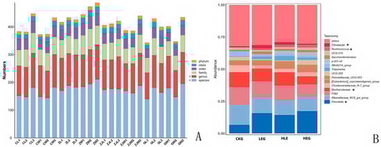 Classification of the bacterial community composition for the yak diets of CKG (0.11 MJ/kg NEG), LEG (2.12 MJ/kg NEG), HEG (2.69 MJ/kg NEG), and HLG (2.69 MJ/kg NEG + 0.02% Lactobacillus). (A) Classification of the microorganisms’ levels. (B) The relative abundance of the top 10 genera of the ruminal microbiome composition profiles revealed by 16S rRNA sequencing (each color represents one bacterial genus). * Significant correlation among the differential treatments (p < 0.05).