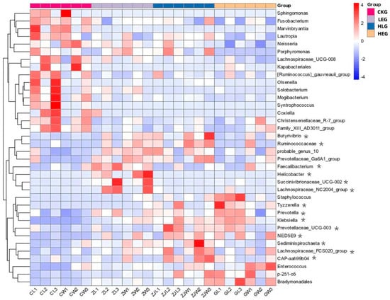 Predicted microbial composition using a heatmap for the yak diets of CKG (0.11 MJ/kg NEG), LEG (2.12 MJ/kg NEG), HEG (2.69 MJ/kg NEG), and HLG (2.69 MJ/kg NEG + 0.02% Lactobacillus). * Significant correlation among the differential treatments (p < 0.05).