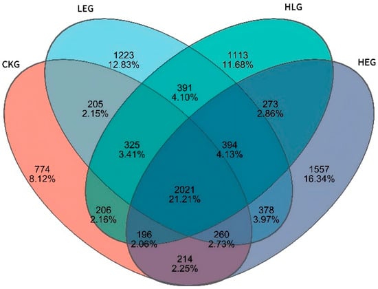Ruminal microbiota Venn diagram for the yak diets of CKG (0.11 MJ/kg NEG), LEG (2.12 MJ/kg NEG), HEG (2.69 MJ/kg NEG), and HLG (2.69 MJ/kg NEG + 0.02% Lactobacillus).