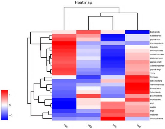 Correlation between the differential treatments and phenotypic traits of the rumen for the yak diets of CKG (0.11 MJ/kg NEG), LEG (2.12 MJ/kg NEG), HEG (2.69 MJ/kg NEG), and HLG (2.69 MJ/kg NEG + 0.02% Lactobacillus). Each row in the graph represents a treatment, each column represents a phenotypic trait, and each lattice represents a Spearman correlation coefficient between a treatment and a morphological trait. Red represents a positive correlation, while blue represents a negative correlation.