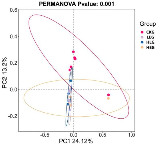 Bacterial PCoA analysis of ruminal microbiota when feeding for the yak diets of CKG (0.11 MJ/kg NEG), LEG (2.12 MJ/kg NEG), HEG (2.69 MJ/kg NEG), and HLG (2.69 MJ/kg NEG + 0.02% Lactobacillus).