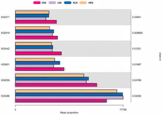 Subsequently, an enrichment analysis was conducted on these KO abundance terms, revealing the top 10 pathways with potential implications for both traditional grazing groups and HED-mediated treatment groups (p < 0.05). Seven of the targeted pathways in the HED-mediated treatment groups showed downregulated expression (Figure 8A), including “Glycine, serine and threonine metabolism”, “Nitrogen metabolism”, “Ribosome”, “Fatty acid biosynthesis”, “Arsenate reductase (glutaredoxin)”, “Oxidative phosphorylation”, and “Phenylalanine metabolism.” Further analysis (CKG, LEG, HLG, and HEG) revealed that “Ribosome” (K02919) and “Fatty acid biosynthesis” (K02371) played vital roles in the synthesis and regulation of short-chain fatty acids in certain rumen microbiota (Figure 8B). “Glycine, serine and threonine metabolism” (K00058), “Ribosome” (K02919), “Fatty acid biosynthesis” (K02371), “Nitrogen metabolism” (K05601), “Amino sugar and nucleotide sugar metabolism” (K02564), “Apoptosis” (K03386), “Ferritin” (K02217), “Thiamine metabolism” (K03149), “Arsenate reductase (glutaredoxin)” (K00537), “Oxidative phosphorylation” (K00334), and “Phenylalanine metabolism” (K00074) were identified as the most enriched KO abundances with the highest generalized fold changes in the Lactobacillus intervention treatment. Additionally, several pathways, such as K00058, K05601, K02919, and K02371, were upregulated in HLG compared to HEG, indicating a positive correlation with Lactobacillus supplementation (Figure 8C–E). It has been reported that fatty-acid-metabolism-related pathways (K00058, K05601, and K02371), protein-synthesis-related pathways (K02919, K02217, K02564, and K00074), and other metabolism-related pathways (K03386, K00537, and K00334) enhance the development of the rumen barrier structure and functional integrity through Lactobacillus-mediated mechanisms, playing a critical role in resisting SCFA intrusion processes induced by HED and promoting rapid regeneration of the rumen mucosa.
