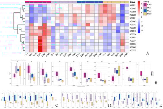 Bacterial KEGG analysis of the KO abundance terms of the ruminal microbiota of the yaks in the diet groups of CKG (0.11 MJ/kg NEG), LEG (2.12 MJ/kg NEG), HEG (2.69 MJ/kg NEG), and HLG (2.69 MJ/kg NEG + 0.02% Lactobacillus). (A) The top 10 pathways with potential implications; (B) the enriched KEGG terms and functions with different treatments; (C–E) the enriched KEGG terms and functions with each two treatments.