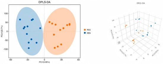 Plot of the 3D-PCA and OPLS-DA scores, and a volcano plot of the ruminal metabolites for the yak diets of HEG (2.69 MJ/kg NEG) and HLG (2.69 MJ/kg NEG + 0.02% Lactobacillus).