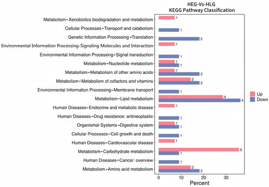 Intrigued by the intricate interplay between rumen microbiota and host co-metabolism, we further explored the spectrum of changes in ruminal metabolites through metabolomics. Using 3D-PCA and OPLS-DA multivariate statistical analysis models, we evaluated the differences between the high-fat diet (HEG) and the Lactobacillus intervention treatment (HLG) via score plots (Figure 9). The 3D-PCA score plots derived from the LC-TOF/MS ruminal fluid metabolic profiles demonstrated a clear separation between HEG and HLG. A distinct separation was observed with Lactobacillus supplementation, indicating that the OPLS-DA model could effectively identify differential metabolites in the yak rumen between HEG and HLG. To further elucidate the differences in the metabolites for the yak rumen under high-fat diet conditions with Lactobacillus intervention, we conducted a differential analysis using volcano plots (Figure 10) and identified 50 metabolites (Table S1). The majority of these differentially abundant metabolites belonged to three major nutrient metabolism categories: amino acids, carbohydrates, and fatty acids. Compared with the yaks on a high-fat diet, 37 metabolites were increased and 13 metabolites were decreased in yaks subjected to the Lactobacillus intervention. These results, from the analysis of the rumen of the Pamir yaks, were involved in multiple biochemical processes, including “Lipid metabolism”, “Carbohydrate metabolism”, “Cell growth and death”, “Translation”, “Amino acid metabolism”, and “Metabolism of other amino acids (Figure 11).