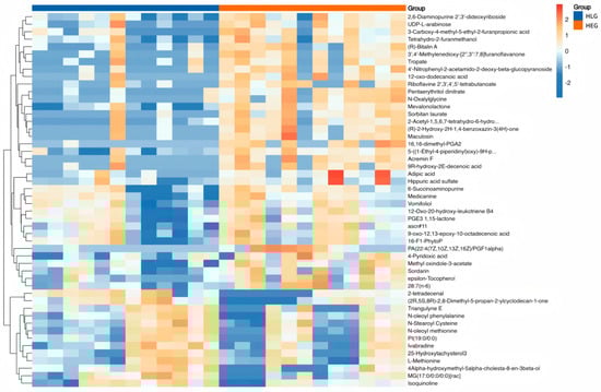 Hierarchical clustering analysis for the identification of different metabolites in the yaks of the diet groups HEG (2.69 MJ/kg NEG) and HLG (2.69 MJ/kg NEG + 0.02% Lactobacillus). Each column in the figure represents a sample, each row represents a metabolite, and the color indicates the relative amounts of the metabolites expressed in the group; red indicates that the metabolite is expressed at high levels, and blue indicates lower expression.