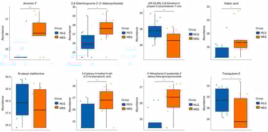 Hierarchical clustering analysis (HCA) with a heatmap was performed to visualize the differences in the yak rumen metabolome associated with HEG and HLG. The hierarchical clustering clearly demonstrated similar clustering patterns of the molecular features within each treatment group. Lactobacillus supplementation significantly impacted the HED-mediated rumen metabolome (p < 0.05), and cluster differences were clearly observable in the HCA-generated heatmap. Interestingly, metabolic pathway enrichment analysis revealed that various metabolites related to fatty acid biosynthesis (Figure 12), such as 2-tetradecenal, Triangulyne E, adipic acid, (2R,5S,8R)-2,8-dimethyl-5-propan-2-ylcyclodecan-1-one, epsilon-tocopherol, 3-carboxy-4-methyl-5-ethyl-2-furanpropionic acid, 16,16-dimethyl-PGA2, sorbitan laurate, Acremin F, 5-((1-Ethyl-4-piperidinyl)oxy)-9H-pyrrolo(2,3-b:5,4-c’)dipyridine-6-carbonitrile, 4′-nitrophenyl-2-acetamido-2-deoxy-beta-glucopyranoside, tetrahydro-2-furanmethanol, N-oleoyl methionine, 3′,4′-methylenedioxy-[2″,3″:7,8]furanoflavanone, 9-oxo-12,13-epoxy-10-octadecenoic acid, 2,6-diaminopurine 2′,3′-dideoxyriboside, pentaerythritol dinitrate, and mevalonolactone were enriched by the Lactobacillus intervention treatment (p < 0.05; rich factor > 0.10). This suggested the fatty acid metabolism of ruminal microbiota under Lactobacillus intervention tended to be normal. Consistent with PICRUSt function prediction pathways, fatty acid metabolism was significantly enriched in yaks subjected to Lactobacillus intervention compared with those on a high-fat diet. The boxplot value for each metabolite was calculated, and the metabolites with significant p-values of p < 0.05 and p < 0.01 were selected as potential biomarkers. Eight metabolites identified through the Student’s t-test (Figure 13) were as follows: Acremin F, 2,6-diaminopurine 2′,3′-dideoxyriboside, (2R,5S,8R)-2,8-dimethyl-5-propan-2-ylcyclodecan-1-one, adipic acid, N-oleoyl methionine, 3-carboxy-4-methyl-5-ethyl-2-furanpropionic acid, 4′-nitrophenyl-2-acetamido-2-deoxy-beta-glucopyranoside, and Triangulyne E.