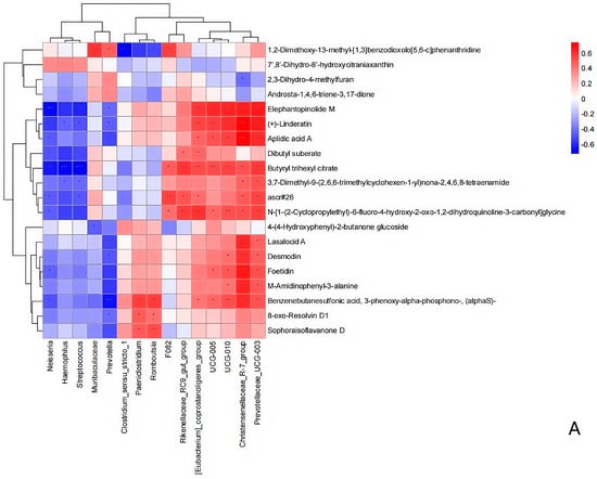 The functional correlation between the ruminal microbiome changes and metabolite perturbations (VIP > 2, p < 0.05) was assessed using a correlation matrix generated by calculating the Spearman correlation coefficient. Significant correlations were identified between the perturbed ruminal microbiota and altered metabolite profiles (r > 0.5 or r < −0.5, p < 0.05). Specifically, Fibrobacter exhibited a negative correlation with 2,6-diaminopurine 2′,3′-dideoxyriboside; Prevotella and Ruminococcus showed positive correlations with (2R,5S,8R)-2,8-dimethyl-5-propan-2-ylcyclodecan-1-one, epsilon-Tocopherol, 3-carboxy-4-methyl-5-ethyl-2-furanpropionic acid, 16,16-dimethyl-PGA2, tetrahydro-2-furanmethanol, N-oleoyl methionine, 3′,4′-methylenedioxy-[2″,3″:7,8]furanoflavanone, 9-oxo-12,13-epoxy-10-octadecenoic acid, 2,6-diaminopurine 2′,3′-dideoxyriboside, and pentaerythritol dinitrate, while displaying negative correlations with Triangulyne E, adipic acid, sorbitan laurate, 5-((1-ethyl-4-piperidinyl)oxy)-9H-pyrrolo(2,3-b:5,4-c’)dipyridine-6-carbonitrile, and mevalonolactone. Muribaculaceae demonstrated a negative correlation with 2-tetradecenal, tetrahydro-2-furanmethanol, 9-oxo-12,13-epoxy-10-octadecenoic acid, 2,6-diaminopurine 2′,3′-dideoxyriboside, and pentaerythritol dinitrate (Figure 14). In summary, the HED-mediated processes induced taxonomic perturbations in the yak ruminal microbiome, which, in conjunction with the Lactobacillus intervention treatment, substantially altered the ruminal metabolomic profile due to changes in diverse ruminal microbiota-related metabolites.