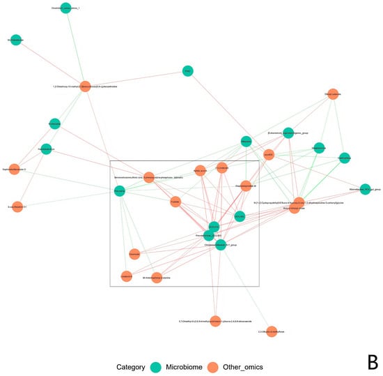 Correlation analysis between the ruminal microbiota and metabolite concentrations (VIP > 2) in the yaks of the diet groups HEG (2.69 MJ/kg NEG) and HLG (2.69 MJ/kg NEG + 0.02% Lactobacillus). (A). Each row in the graph represents a metabolite, each column represents a ruminal microbiota, and each lattice represents a Pearson correlation coefficient between a component and a metabolite. Red represents a positive correlation, while blue represents a negative correlation. * Significant correlation between HLG and HEG (p < 0.05), ** Significant correlation between HLG and HEG (p < 0.01), *** Significant correlation between HLG and HEG (p < 0.001). (B). The interaction network between microorganisms (genus level) and metabolites is presented. The boxe denote the aggregation status of target microorganisms and metabolites.