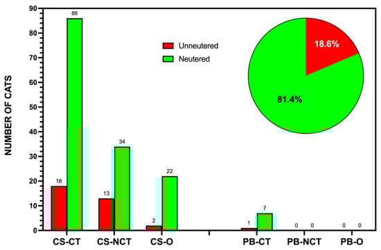 The effectiveness of the July 2024 sterilization campaign in La Graciosa, Canary Islands. The bar chart shows the number of neutered (green) versus unneutered (red) cats recorded across different feeding points in Caleta de Sebo and Pedro Barba immediately following the campaign. The pie chart inset illustrates the overall sterilization rate achieved, with 81.4% of the community cat population sterilized and 18.6% remaining unsterilized post-intervention.