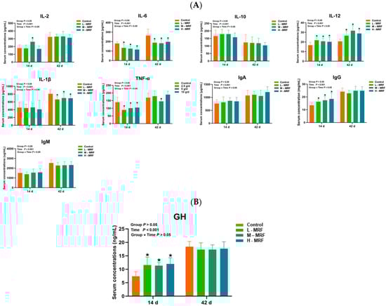 Effects of MRF on serum factors in dairy calves (n = 10). (A) Serum inflammatory factors; (B) GH (growth hormone). * p < 0.05. IL-2, Interleukin-2; IL-6, Interleukin-6; IL-10, Interleukin-10; IL-12, Interleukin-12; IL-1β, Interleukin-1β; TNF-α, Tumor Necrosis Factor-α; IgA, immunoglobulin A; IgG, immunoglobulin G; IgM, immunoglobulin M; GH, growth hormone. L-MRF = 2.5 g/d; M-MRF = 5 g/d; H-MRF = 10 g/d.