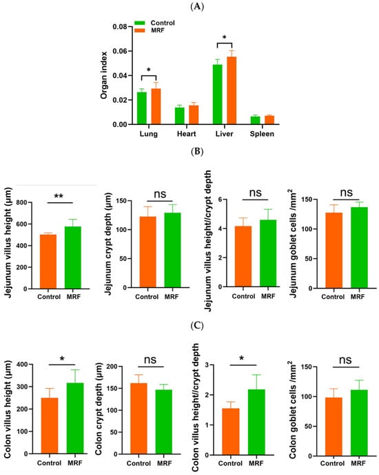 Effects of MRF on intestinal morphology in dairy calves (n = 6). (A) organ index; (B) villus height, crypt depth, villus height/crypt depth, and goblet cell number in the jejunum; (C) villus height, crypt depth, villus height/crypt depth, and goblet cell number in the colon; (D) intestinal morphology. MRF = 5 g/d. ** represents p < 0.01; * represents p < 0.05; ns represents p > 0.05.