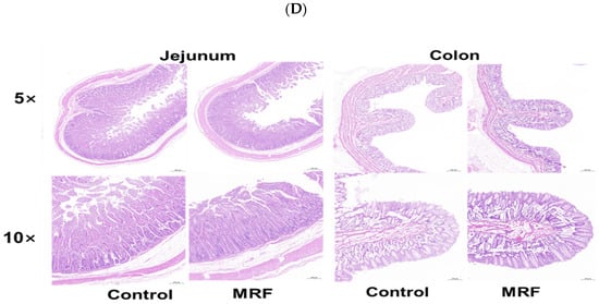 The lower jejunal IL-2 and colonic IL-10 levels implied a targeted immunomodulatory effect of MRF. This may be due to mitigation of harmful bacteria by MRF and consequential beneficial shifts in the intestinal microbial environment. MRF has been shown to bind to specific mannose lectin receptors on pathogenic bacteria, effectively reducing their presence in the intestine, and it may curb the adverse impact of harmful bacteria on the intestinal microbiota by doing so [39]. A healthier microbial environment lowers the risk of immune over-activation [40]. IL-2 is crucial for T-lymphocyte activation and proliferation, and lower levels in the jejunum may suggest that MRF is regulating local immune activation in this region, potentially preventing over-activation [41]. This helps maintain immune homeostasis, ensuring that the immune response is appropriately regulated and does not cause unnecessary inflammation. IL-10, a powerful suppressor of Th1 cytokines, restrains the production of pro-inflammatory cytokines like TNF-α and IL-6 and is crucial for sustaining immune homeostasis and averting immune-related inflammatory disorders triggered by pathogens [42,43]. In the colon, the decrease in IL-10 level might seem counterintuitive at first. To understand this phenomenon, it is essential to consider the unique characteristics of the intestinal environment. Different regions of the intestine have distinct microbiota compositions and immune cell distributions [44]. It is hypothesized that upon application of MRF, it may preferentially target and inhibit harmful bacteria in the colon [28]. As a result, the threat of inflammation posed by these pathogens is reduced. With a lower pathogenic load, the body may no longer require high levels of IL-10 to counteract excessive inflammation, thus leading to a decrease in its levels.