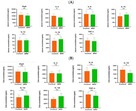 Effects of MRF on the jejunum and colon of dairy calves (n = 6). (A) Jejunum and (B) colon inflammatory factors. * p < 0.05. sIgA, secretory immunoglobulin A; IL-2, Interleukin-2; IL-6, Interleukin-6; IL-10, Interleukin-10; IL-12, Interleukin-12; IL-1β, Inter-leukin-1β; TNF-α, Tumor Necrosis Factor-α. MRF = 5 g/d. ns represents p > 0.05.
