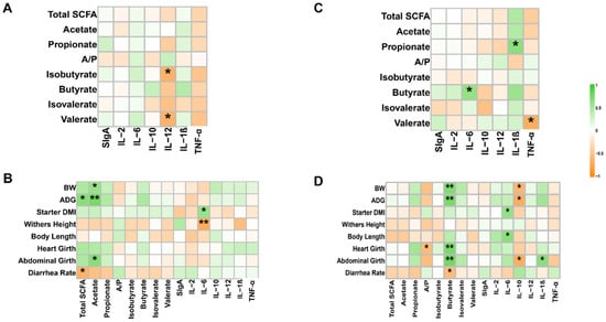 Correlation between phenotypes, SCFAs, and inflammatory factors (n = 6). (A) Correlation of jejunum SCFAs with inflammatory factors. Spearman’s correlation coefficients were used to evaluate associations. * p < 0.05. (B) Correlation of phenotypes with jejunum SCFAs and inflammatory factors. Spearman’s correlation coefficients were used to evaluate associations. * p < 0.05; ** p < 0.01. (C) Correlation of colon SCFAs with inflammatory factors. Spearman’s correlation coefficients were used to evaluate associations. * p < 0.05. (D) Correlation of phenotypes with colon SCFAs and inflammatory factors. Spearman’s correlation coefficients were used to evaluate associations. * p < 0.05, ** p < 0.01. Total SCFA, total short-chain fatty acids; A/P, the ratio of acetate/propionate; sIgA, secretory immunoglobulin A; IL-2, Interleukin-2; IL-6, Interleukin-6; IL-10, Interleukin-10; IL-12, Interleukin-12; IL-1β, Inter-leukin-1β; TNF-α, Tumor Necrosis Factor-α.