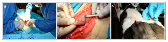 Endotracheal intubation was performed while the calves were in sternal recumbency by means of laryngoscopy. An orogastric tube was also passed to promptly decompress the rumen and to allow the emission of the continuous gas formed, thereby avoiding ruminal meteorism during surgery. Anesthesia was maintained by intermittent positive pressure ventilation (IPPV) (Kontron Instruments ABT-4100 Anesthesia Respirator, San Diego, CA, USA) with E.T. 0.8–1.1% isoflurane (IsoFlo, ZOETIS SRL, Roma, Italy, Europe) in oxygen. Supportive fluid IV administration was carried out using dextrose–electrolyte solution to avoid hypoglycemia. Butorphanol tartrate (0.02 mg/kg IV) (Nargesicl, Richter Pharma AG, Wels, Austria, Europe) was administered previously as preemptive analgesia and during the surgical procedure by constant rate infusion (CRI) (24 µg/kg/h) [19].