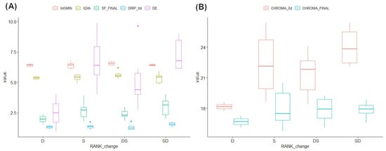 Box plots of beef quality variables from animals classified as dominant (D); dominant changing to subordinate (DS); subordinate (S); or subordinate changing to dominant (SD). (A) Values on the y axis: (A) X45MIN = pH 45 min postmortem; X24h = pH 24 h postmortem; SF = final shear force; DRIP_0d = drip loss 0 d postmortem; and DE = total change in color after display. (B) CHROMA_0d = CHROMA 0 d postmortem; CHROMA_FINAL = final chroma value.