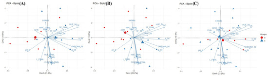 A biplot of the PCA with the physicochemical traits of the longissimus thoracis at (A) 72 h, (B) 6 weeks of fattening, and (C) slaughterhouse reception/waiting.