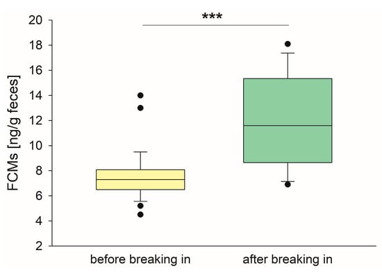 So far, stress is usually measured by assessing clinical (heart rate, body weight, and activity level) and endocrinological (plasma cortisol, catecholamine, and beta-endorphin concentrations) parameters []. Due to the fact that stress leads to increased glucocorticoid secretion by increasing the activity of the hypothalamo–pituitary–adrenal axis [], there are already numerous studies that identified assumingly stressful situations for horses by means of increases in cortisol release. Besides typical situations like training [,], transport [,,,], competitions [,,], veterinary examinations [,], social instability [], and inadequate management and housing conditions [,,], all of which have been shown to increase plasma cortisol levels, breaking-in, i.e., the transition from a young, unridden horse to a riding horse and sport partner for humans, can also be seen as a stressful situation for the animal. Animal welfare organizations are increasingly criticizing equestrian sports for the potentially negative impact it may have on horses, particularly equine athletes at a high-performance level and young horses during breaking-in. However, there are only few studies that investigate the actual stress level of horses during initial training. Schmidt et al. identified particularly the mounting of a rider as a stressor for 3-year-old sport horses [] and demonstrated a quick adaptation to the new situation, while Pilger et al. reported that also the pretraining of young stallions leads to an initial stress response []. Both studies determined changes in salivary cortisol concentrations, heart rate, and heart rate variability and thus had to manipulate the animals repeatedly, which could additionally have stressed the young horses. In contrast, Gorgasser et al. did not find any increase in adrenocortical activity in young Quarter horses within the first month of training using fecal cortisol metabolites (FCMs) as indicator and thus concluded that the animals were able to deal well with their new tasks []. All of these studies investigated stress levels in the horses only during the training period, neglecting the possibility of generally increased baseline values due to the onset of training, and a comparison over a longer period of time, e.g., between horses that are not trained at all, more experienced riding horses, and horses during initial training, is lacking. Therefore, from the current state of the literature it cannot be concluded whether the transition phase is particularly stressful for horses or not. In this pilot study, we aimed to examine if the stress levels in horses during breaking-in differ from those in horses that are not ridden or more experienced horses in training.