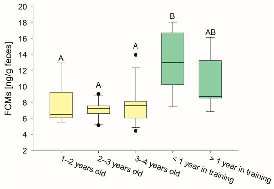 Newly broken-in horses had higher FCM concentrations compared to unridden horses. Horses that have been ridden for less than one year had significantly higher FCM levels than horses that were not yet broken-in. After more than one year in training there was no statistical difference between FCM levels in horses in training (green boxes) and unridden horses (yellow boxes). Boxplots represent median FCM concentrations (line) in the different age groups ± 25th and 75th percentiles (box) and 10th and 90th percentiles (whiskers). Outliers are indicated by dots. Different letters indicate significant differences between groups, p < 0.01, one way ANOVA + post hoc Holm–Sidak test.