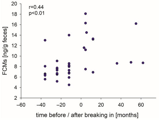 Relation between FCM levels of individual horses and the time (months) before and after breaking-in, respectively.
